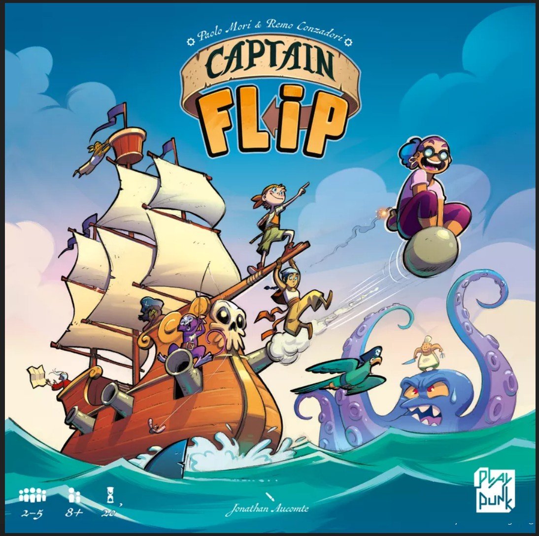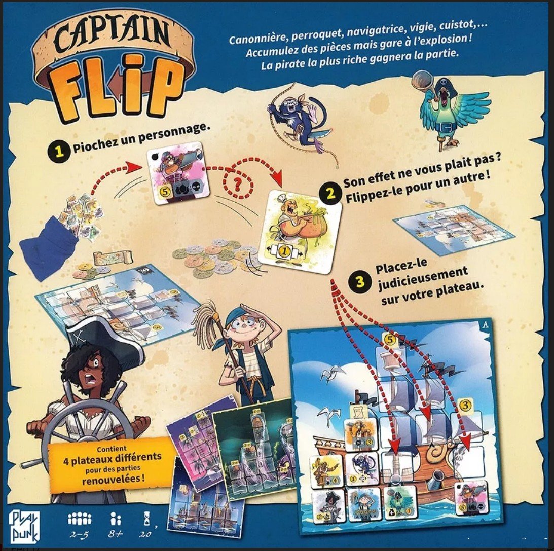 "Captain Flip" предназначена для 2-6 игроков, и игровое время составляет от 60 до 90 минут. Цель игры — набрать наибольшее количество очков, выполняя различные задания и сражаясь с противниками. Игроки поочередно выполняют ходы, состоящие из следующих этапов: