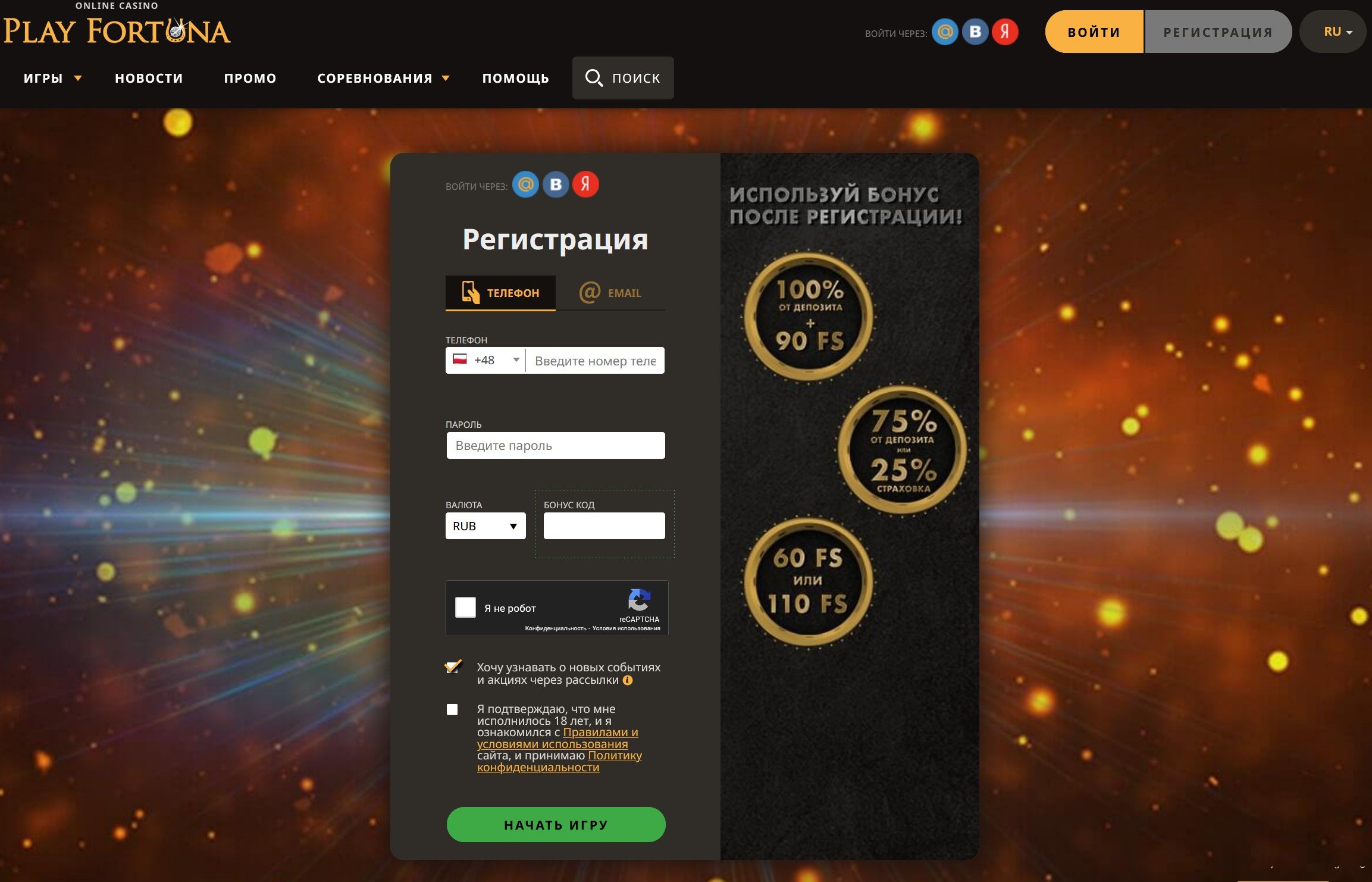Регистрация и бонусы через рабочую ссылку