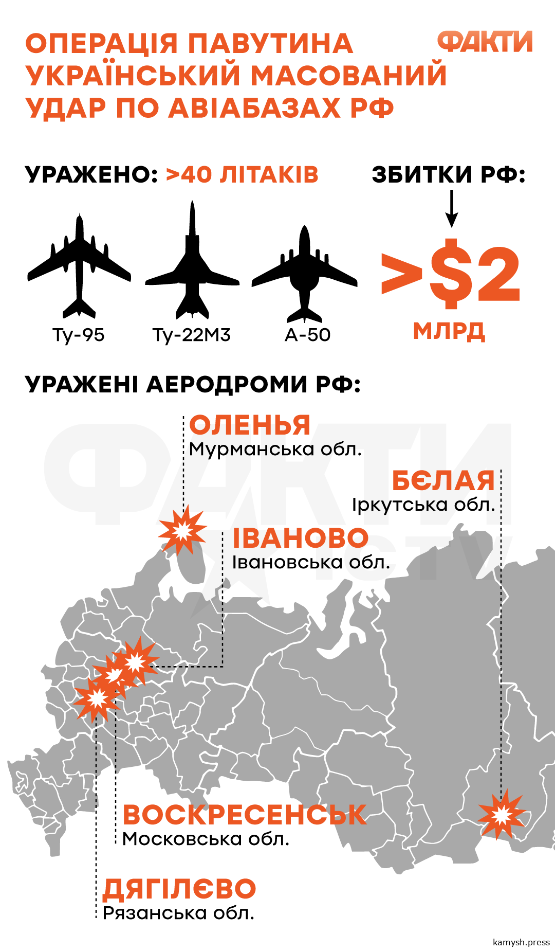 Целями операции стали аэродромы, где базируются стратегические бомбардировщики, регулярно используемые Россией для нанесения ракетных ударов по украинским городам. Аэродром Белая в Иркутской области, расположенный в 4300 км от линии фронта, и Оленья в Мурманской области, в 1800 км от границы Украины, считаются ключевыми базами для Ту-95, Ту-22М3 и Ту-160 — самолетов, способных нести ядерное оружие и крылатые ракеты большой дальности, такие как Х-22 и Х-32. Аэродромы Дягилево и Иваново, расположенные ближе к Украине, также играют важную роль в российских воздушных операциях, включая размещение самолетов А-50, которые обеспечивают разведку и координацию ударов.